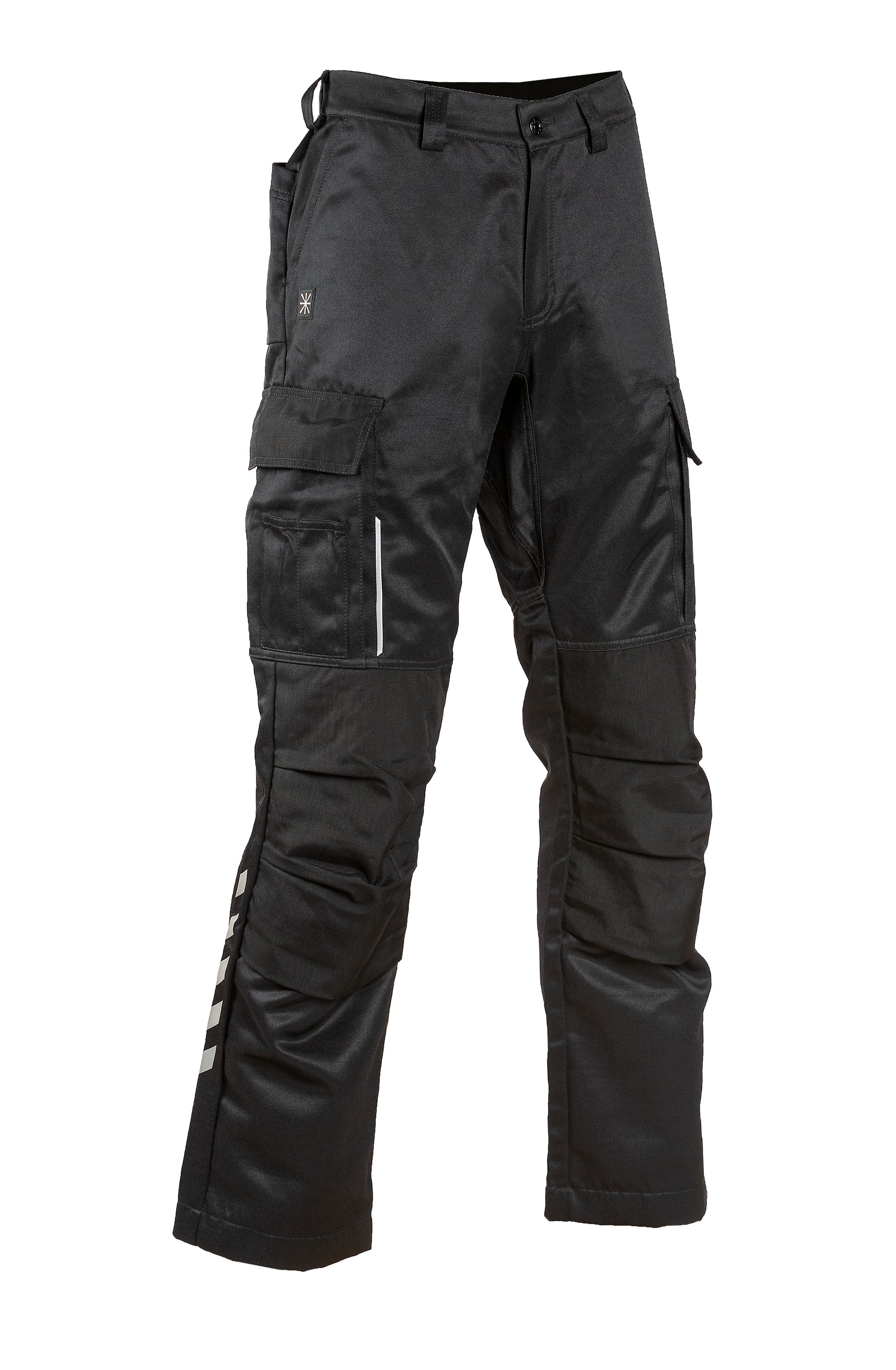 Työhousut likaa ja vettä hylkivästä materiaalista. Käyttömukavuutta tuo haarakiila ja kuminauha takana vyötäröllä. Runsaasti taskutilaa työvälineille ja polvisuojataskut kahdella eri korkeudella.
