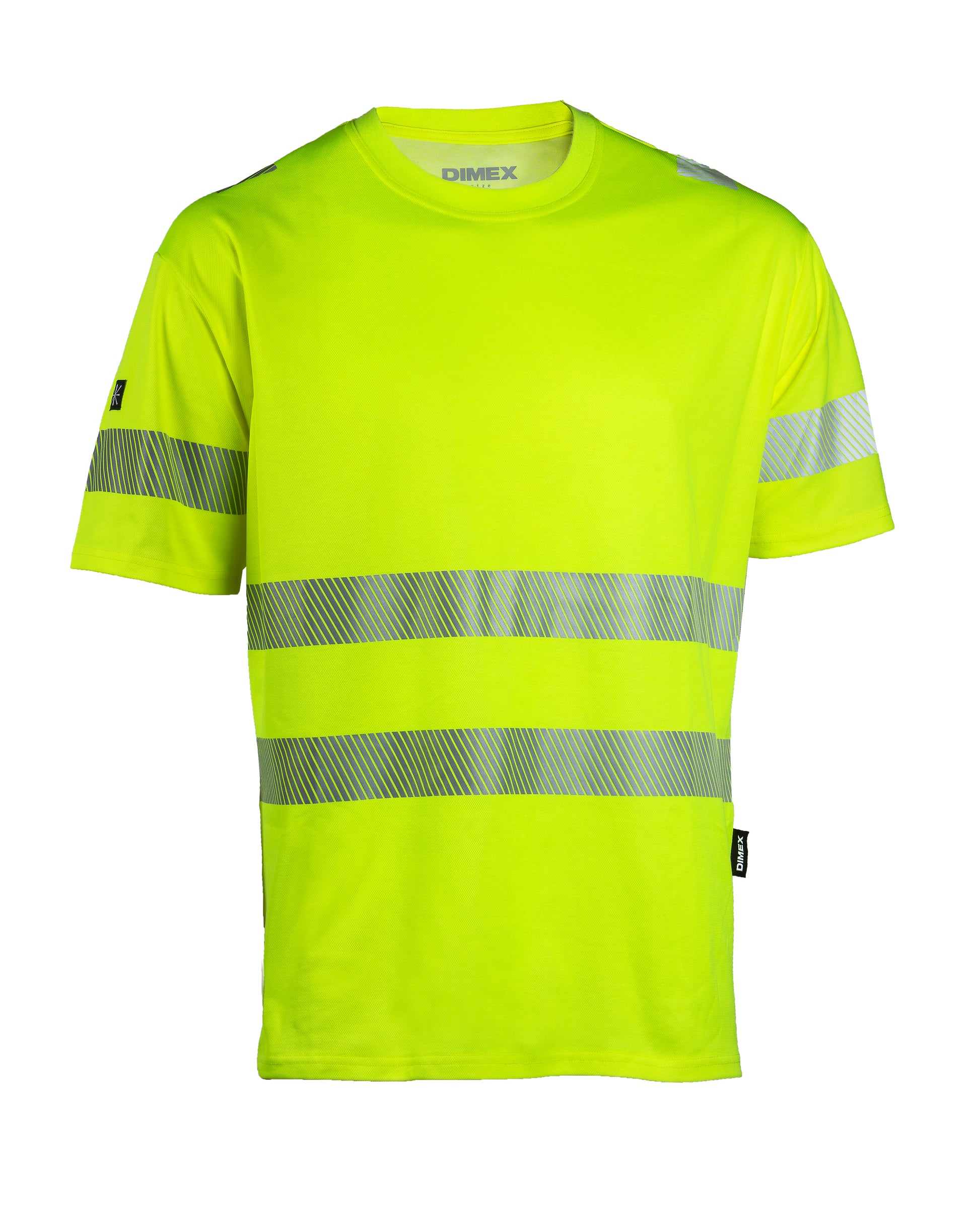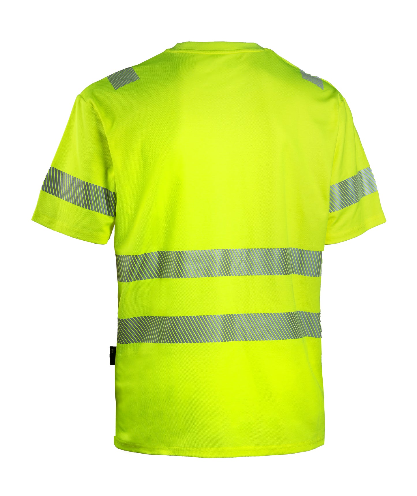 Huomiovärinen T-Paita, jossa näkyvyyttä lisää olkaheijastimet. Miellyttävää puuvilla polyesteri materiaalia.