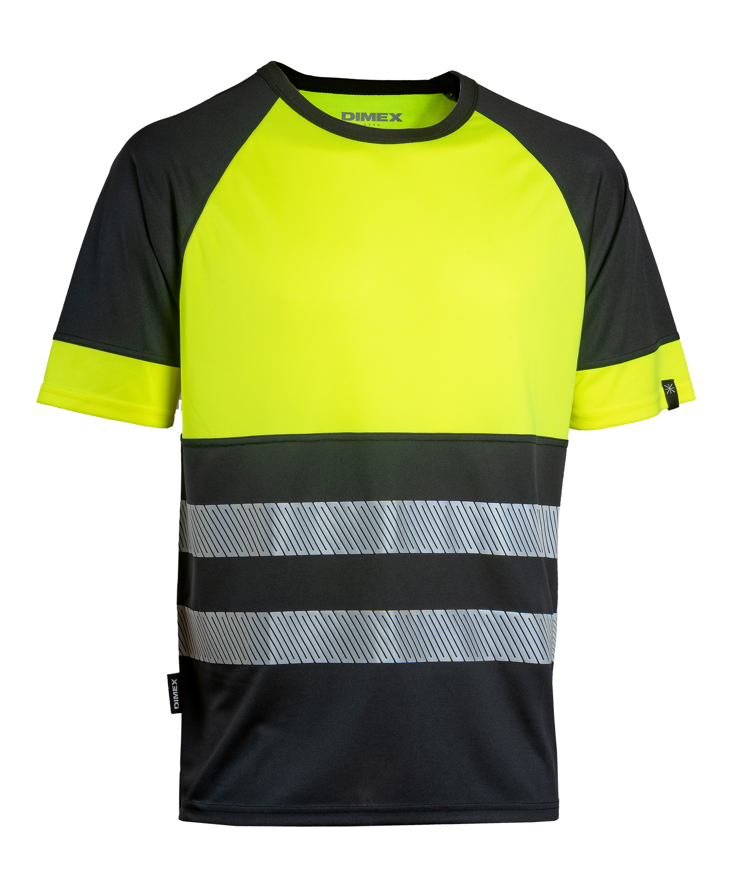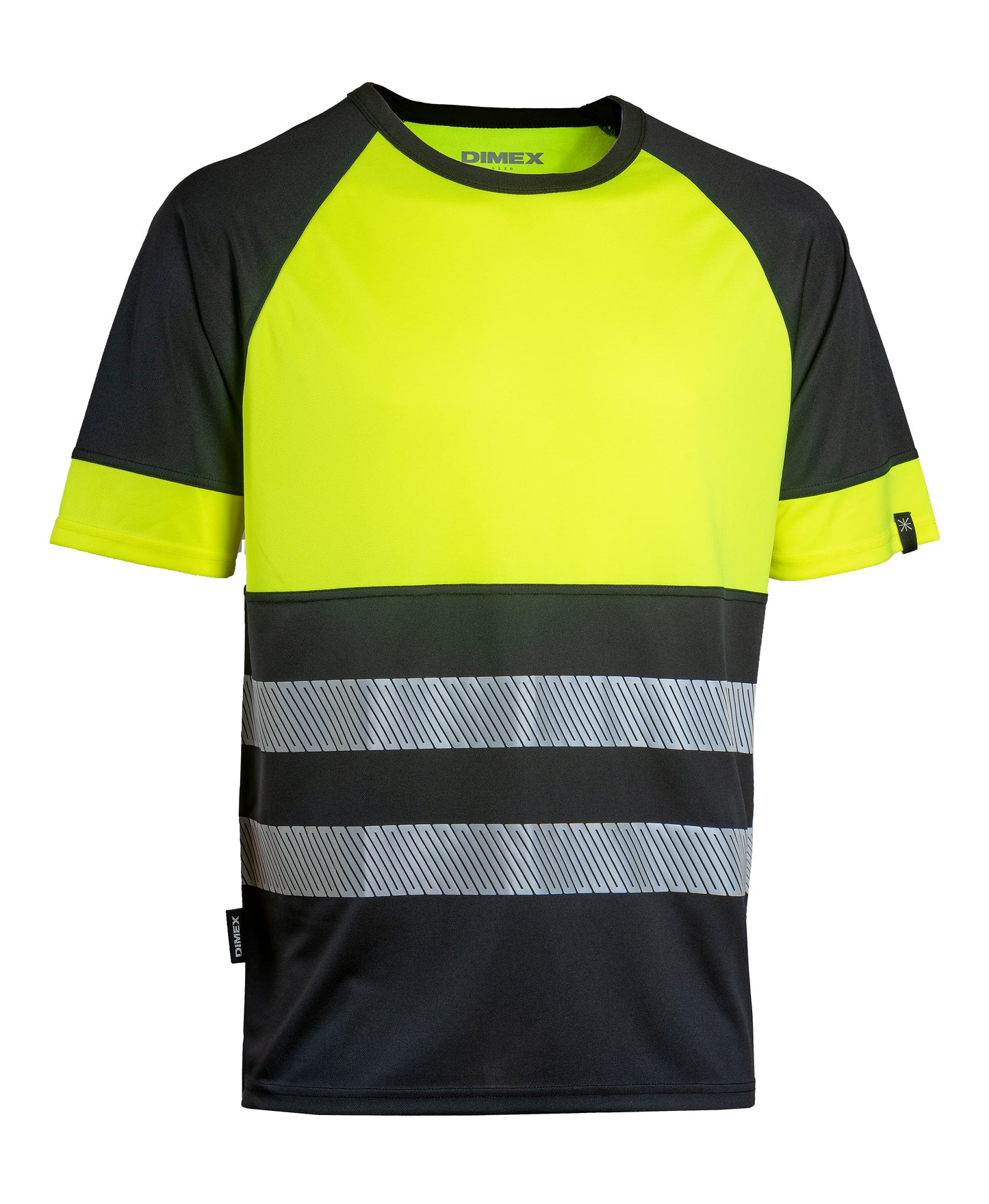 Huomiovärinen näkyvyysluokan 1 työpaita kevyestä materiaalista. Musta paidan helma on käytännöllinen työssä, jossa vaatteet likaantuvat helposti.