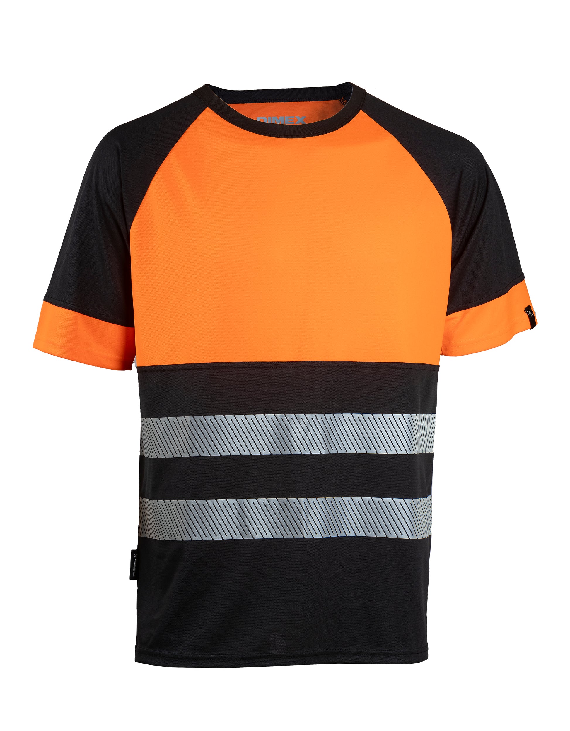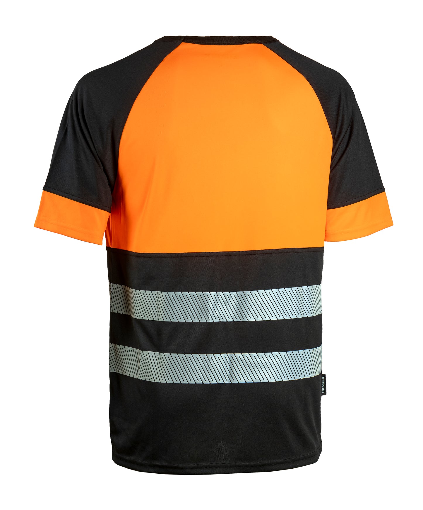 Huomiovärinen näkyvyysluokan 1 työpaita kevyestä materiaalista. Musta paidan helma on käytännöllinen työssä, jossa vaatteet likaantuvat helposti.