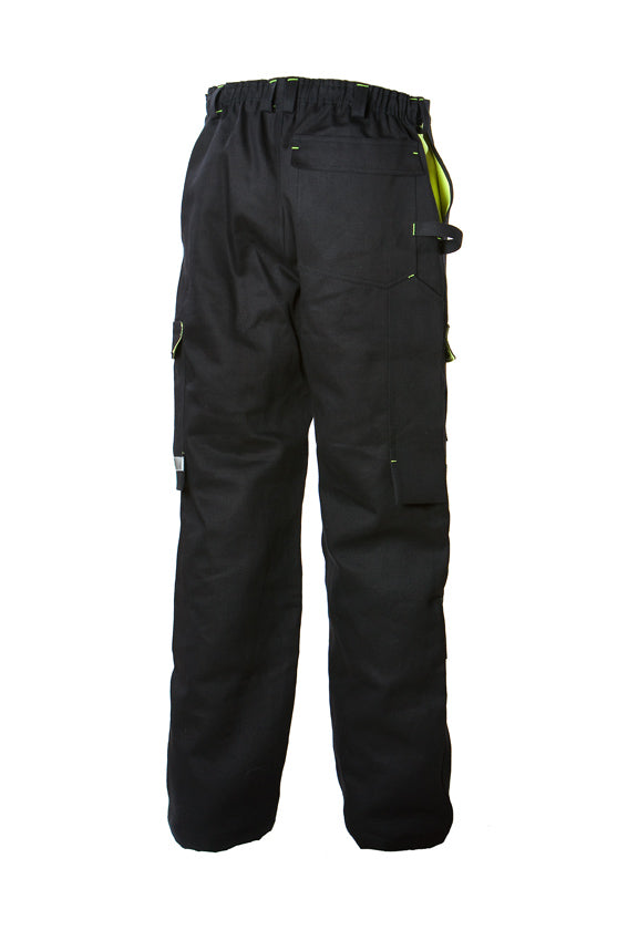 Palosuojatut työhousut, joissa hyvin taskutilaa työvälineille. Housuissa on taskut myös polvisuojille. Käyttömukavuutta lisää vyötärön takakuminauha.