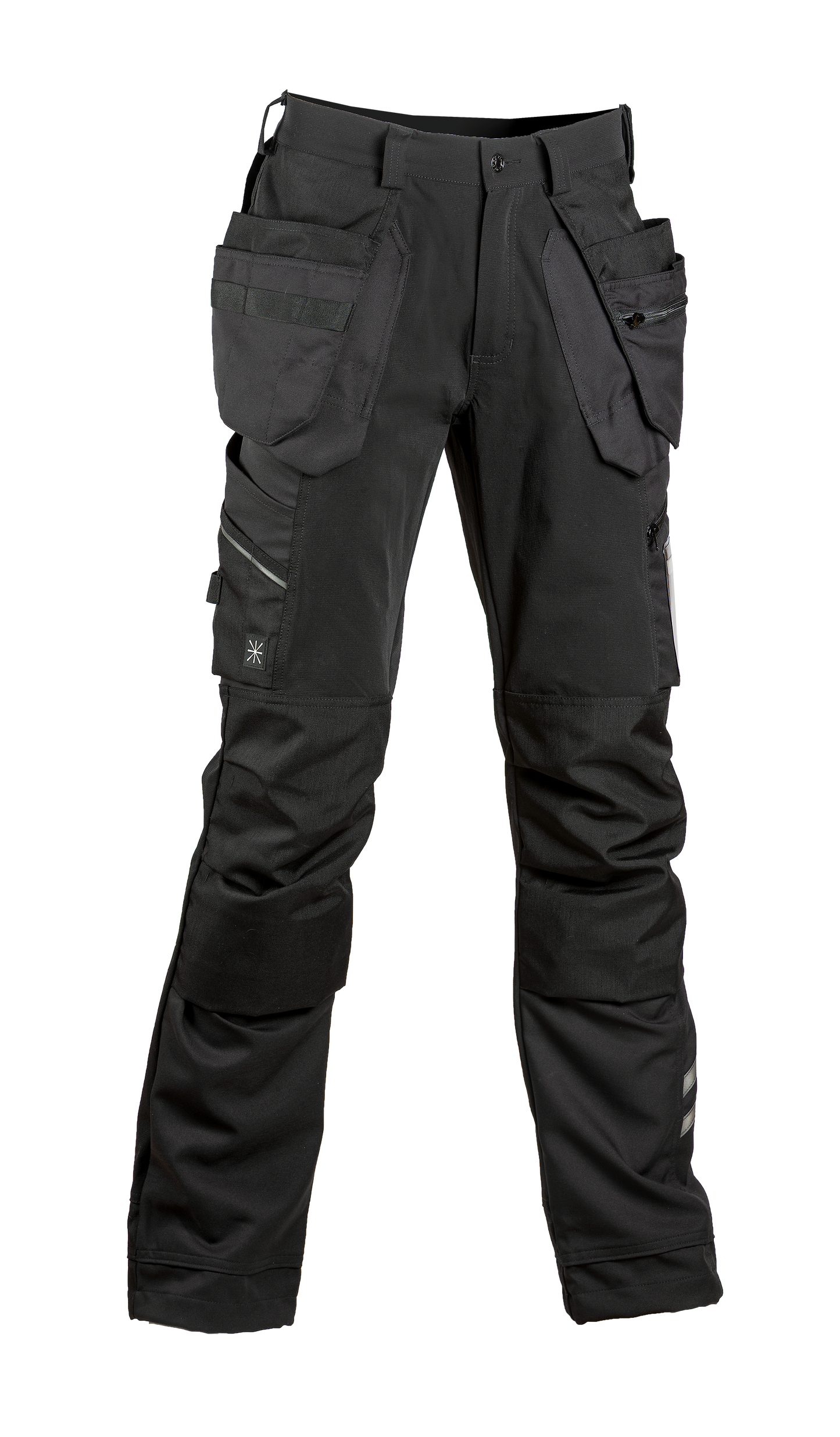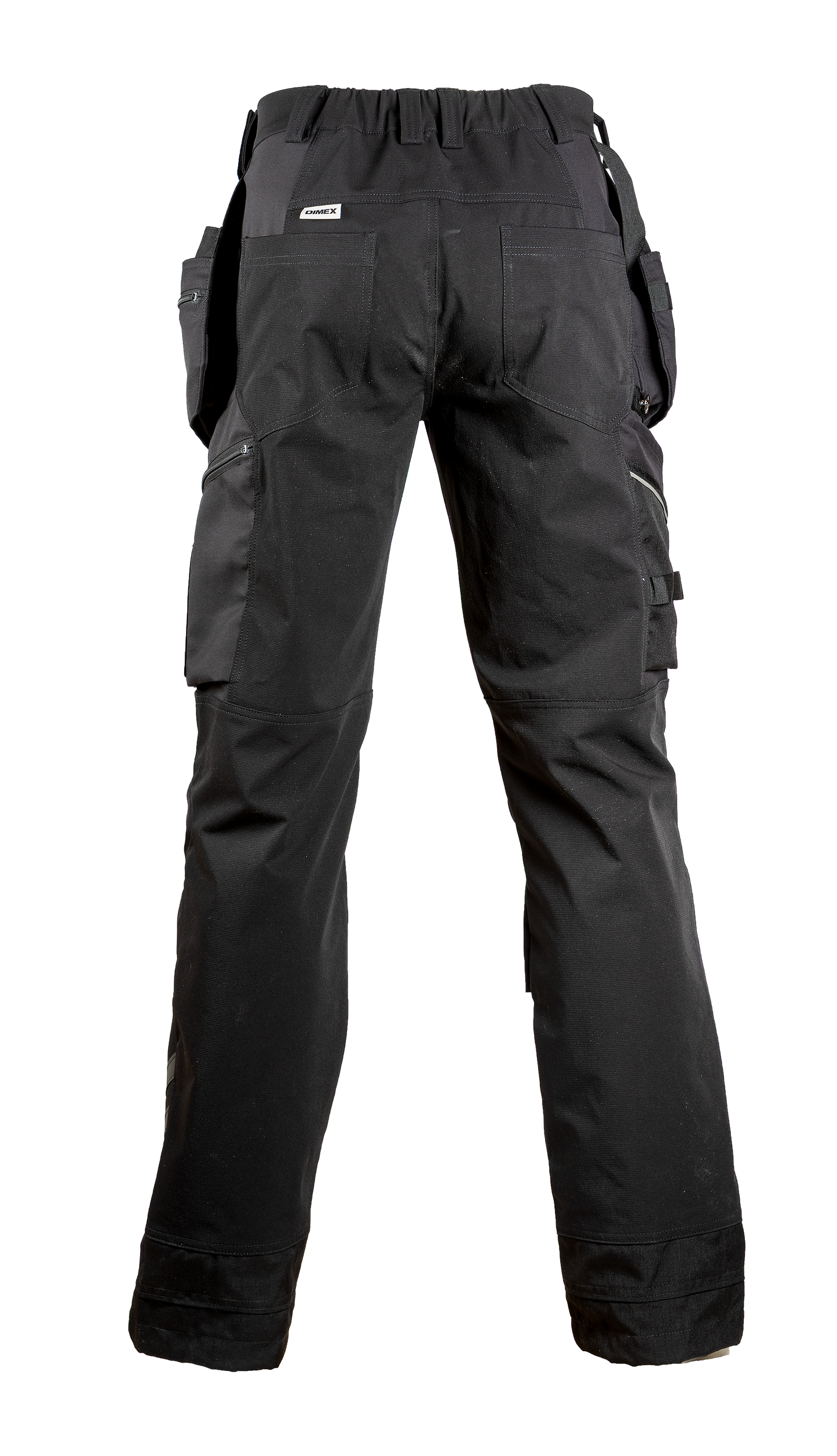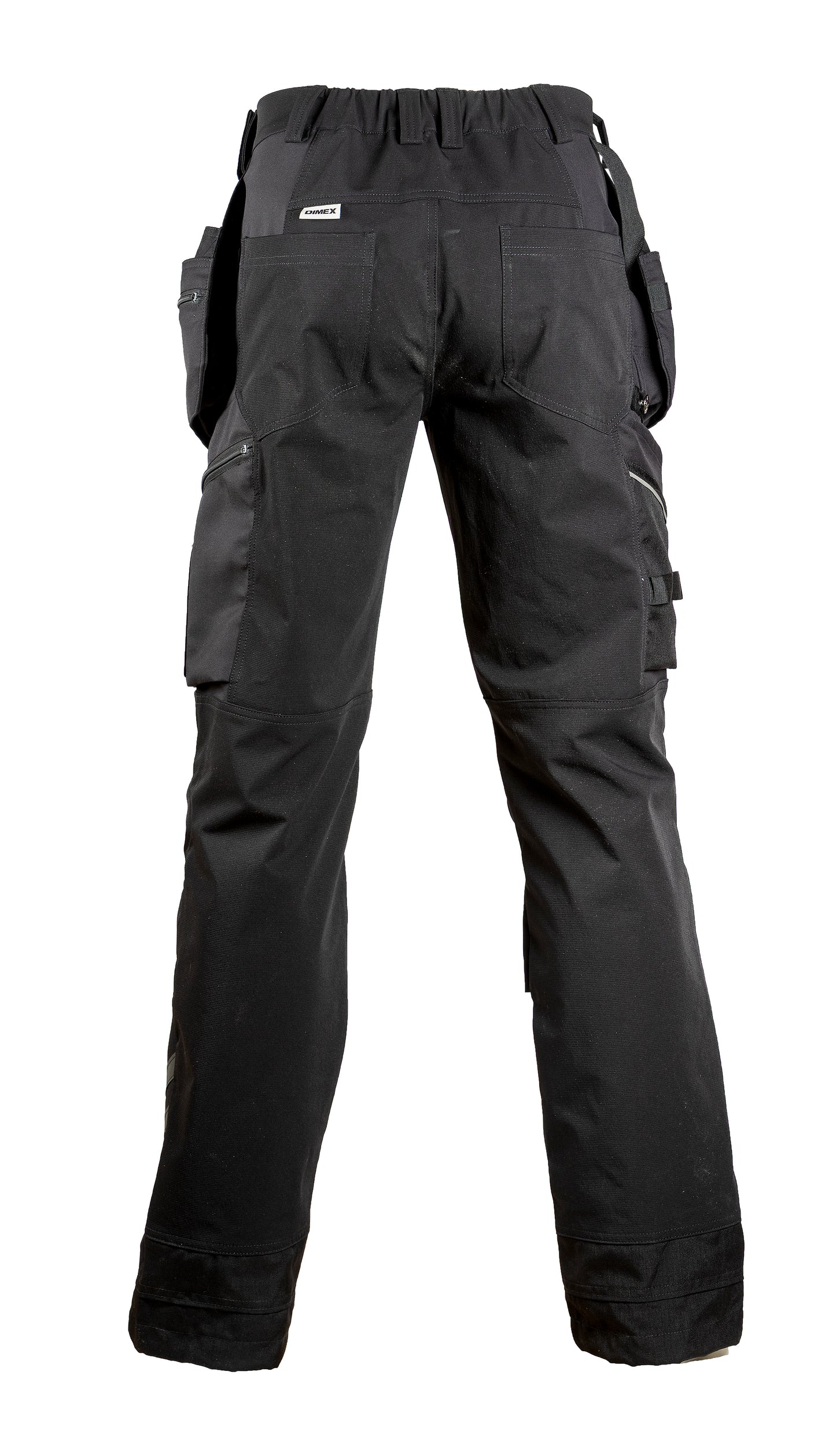 Cordura-vahvistetut etutaskut Riipputaskut, vetoketjullinen tasku ja avoin tasku vasemmalla puolella Kaksi avointa taskua ja työkalulenkit oikealla puolella Vetoketjullinen tasku vasemmassa lahkeessa Reisitasku, jossa kynätaskut, veitsilenkki ja nappi oikealla Avoimet takataskut 2-in-1 -polvisuojataskut muotoilluilla polvileikkauksilla Vaakasuuntainen henkilökorttitasku Työkalulenkit ja vyölenkit Lahkeensuussa 5 cm lisäpituus / -lyhennysmahdollisuus lahkeessa Pesu 60 asteessa
