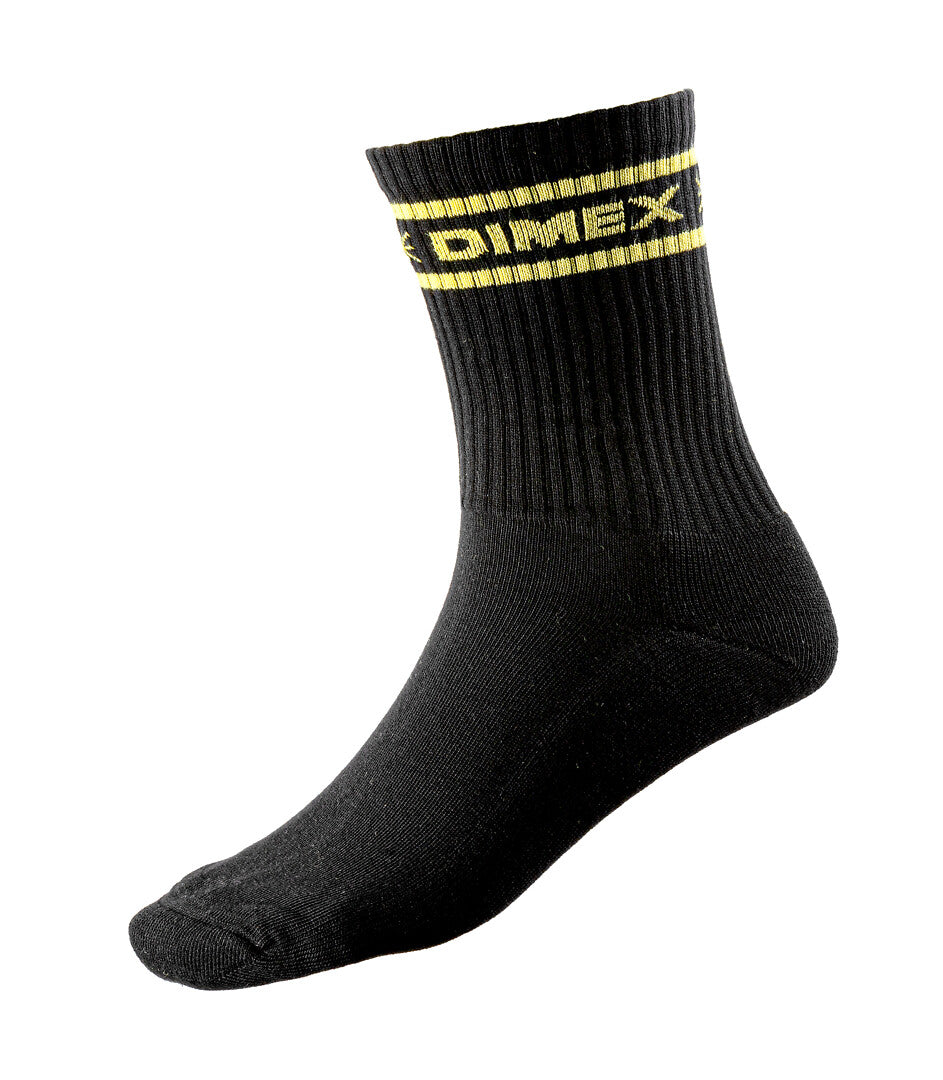 Kestävät Dimex sukat keltaisilla varren yksityiskohdilla. Vahvistettu pohja ja kanta kestää kovempaakin käyttöä.