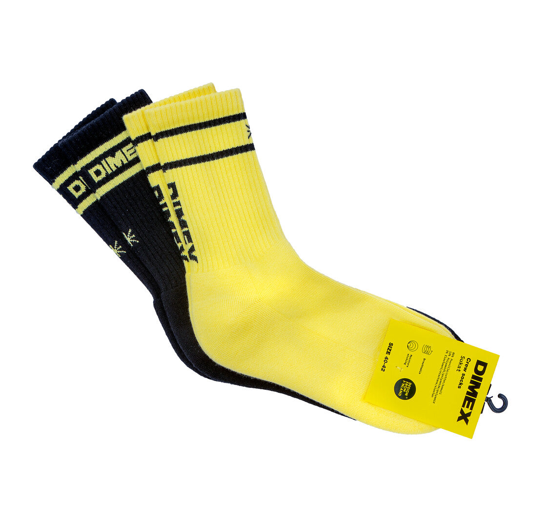 Kahden sukkaparin paketti kestäviä Dimex sukkia. Mustat ja keltaiset. Vahvistettu pohja ja kanta kestävät kovempaakin käyttöä. Tyylikkäät Dimex brändäykset varressa.